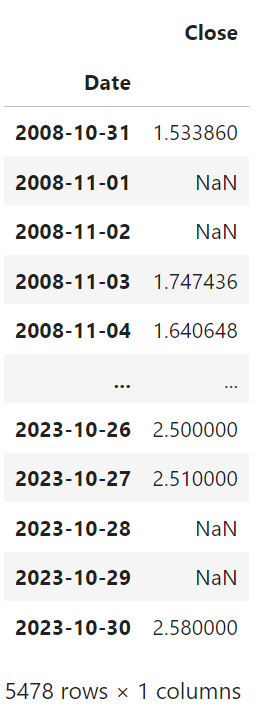 The dataset features 6 value columns: Open, High, Low, Close, Adj Close and Volume. For this timeseries forecasting project, we are only concerned about the closing price of the trust. Using pandas, we can isolate this target column, and set the Date column as the index of the series. Converting the index into the standard DateTime format of Pandas, we see below that several NaN values appear.