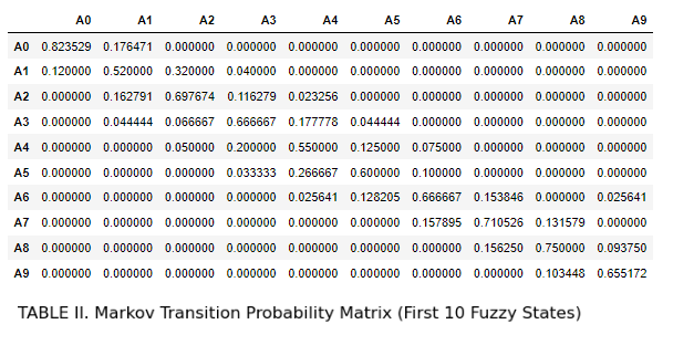 The core of our model is a fuzzy inference engine, which relies on a Markov transition probability matrix to produce forecasts in the fuzzy domain. These forecasts are then converted back to precise values using a simplified version of a formula from Alyousifi et al. We evaluated our model’s performance using four statistical metrics (RMSE, MAPE, Theil’s U, and R2) and two profitability metrics (net profit and P/L), comparing it against six other models. Our model, with its 50 centroids, consistently outperformed the others, notably a GRID-FTS model with 100 partitions.