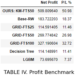 We can see that we’re able to generate the most profit of SG$ 509.80 corresponding to a profit margin of 50.98% across 1 year, again, outperforming the other models in our benchmarks. Surprisingly, GRID-FTS50, a model that was not able to beat the random walk model in the statistical benchmarks shown in Table III, now beats random walk in the profit benchmark by a considerable margin of 26.98% vs 18.37%, respectively. This goes to show that trading strategy is just as crucial as time-series forecasting in building a robust trading model.